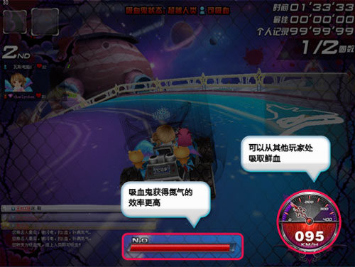 当有玩家的HP耗尽,会被德古拉控制,转变为吸血鬼!吸血鬼能更加容易的获得氮气,同时,当他超过前面的人类玩家时,可以吸取一点HP。比赛中有吸血鬼出现后,人类玩家需要加速逃亡,他们可以通过默认按空格键献祭一点鲜血获得1个氮气,这是策略性玩法还是饮鸩止渴?一切尽在于您的选择!