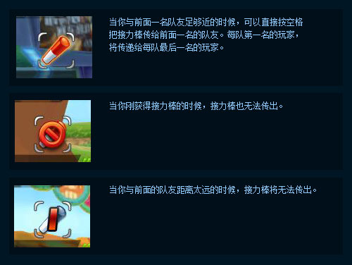 当你与前面一名队友足够近的时候,可以直接按空格把接力棒传给前面一名的队友。每队第一名的玩家,将传递给每队最后一名的玩家。