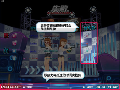 接力棒先到达终点的队伍将获胜!在接力模式中加入了新的数值"合作值",用以体现大家在接力模式中的合作精神。主动传棒的次数多,也会获得更多的经验和合作值的奖励!